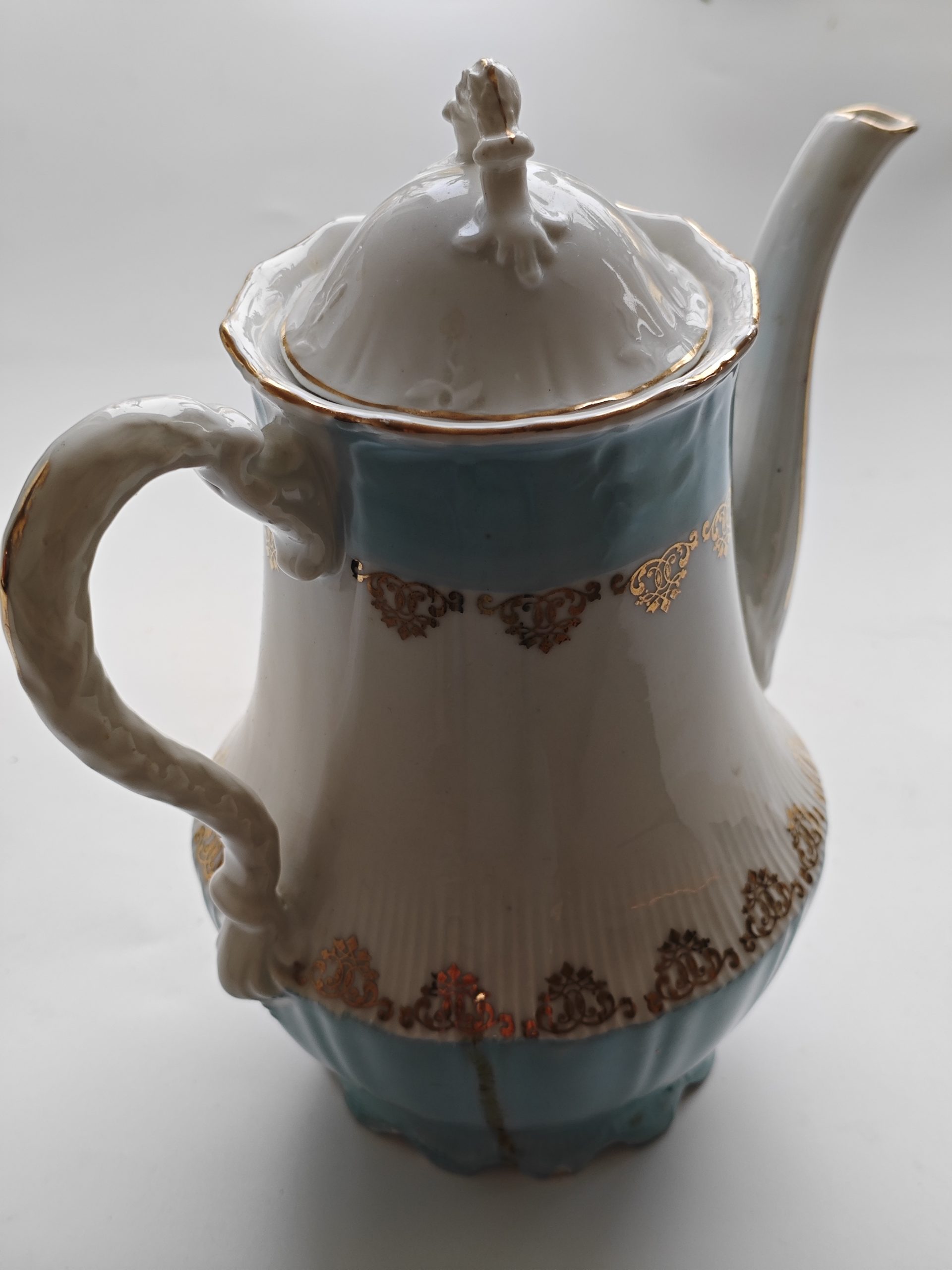 Elegante vintage koffie/theepot van C.T. Altwasser (CT), met turquoise accenten en verfijnde gouddecoratie. Klassiek porselein met een tijdloze uitstraling.