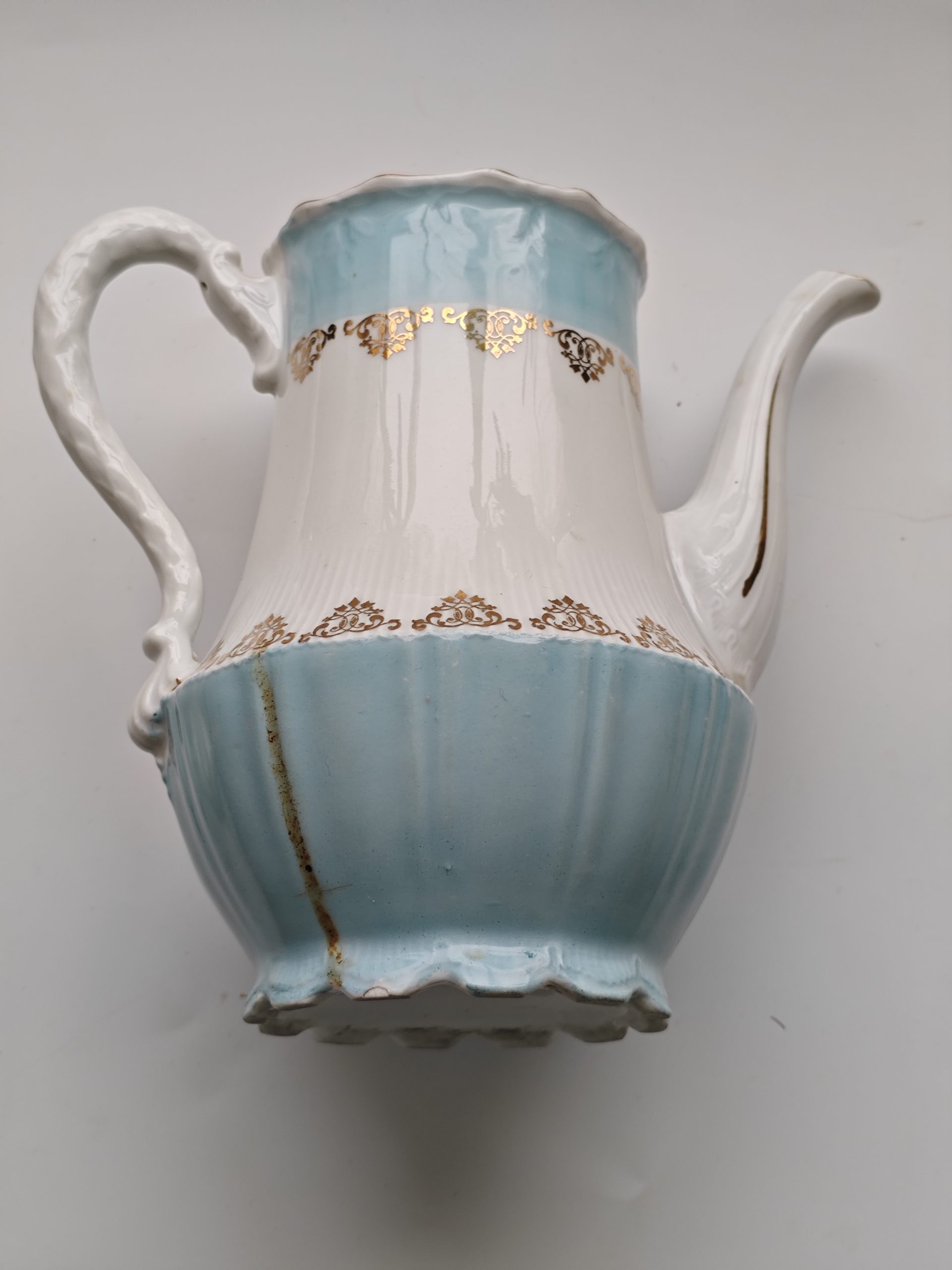 Een elegante porseleinen koffie- of theepot in klassieke stijl. De pot heeft een bolle, sierlijke vorm met een gebroken witte basis gecombineerd met zacht turquoise/blauwe accenten op de schouder en onderzijde.