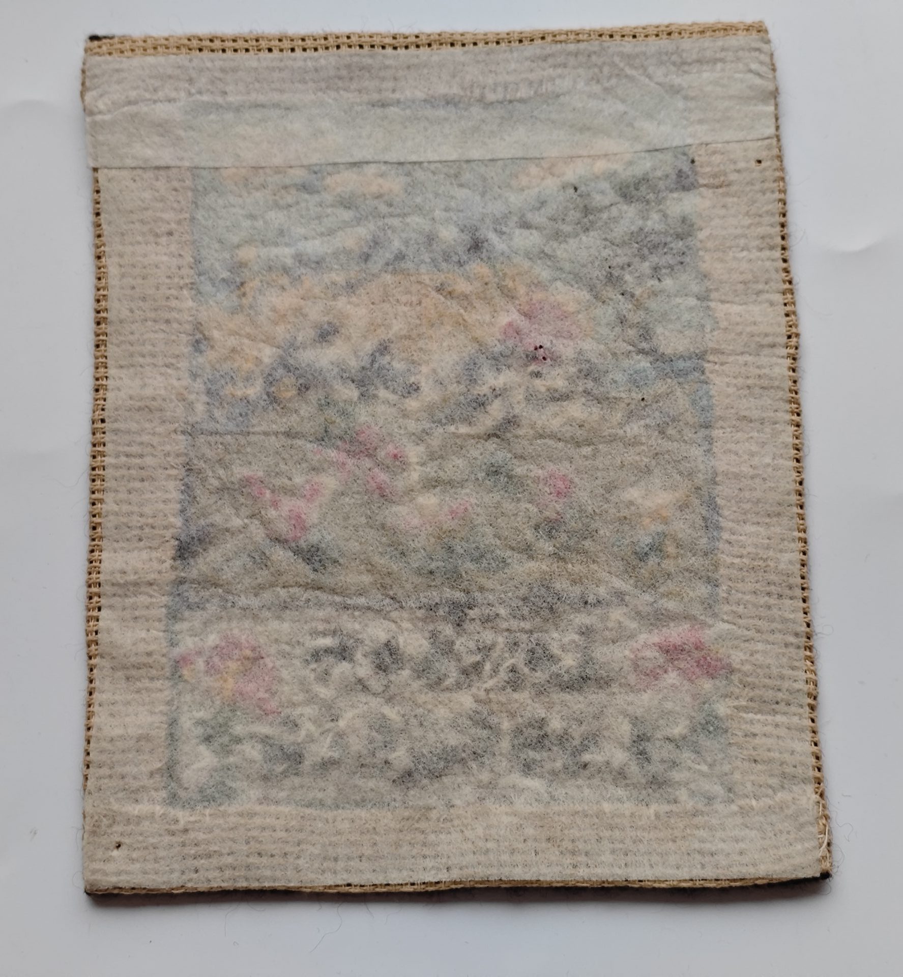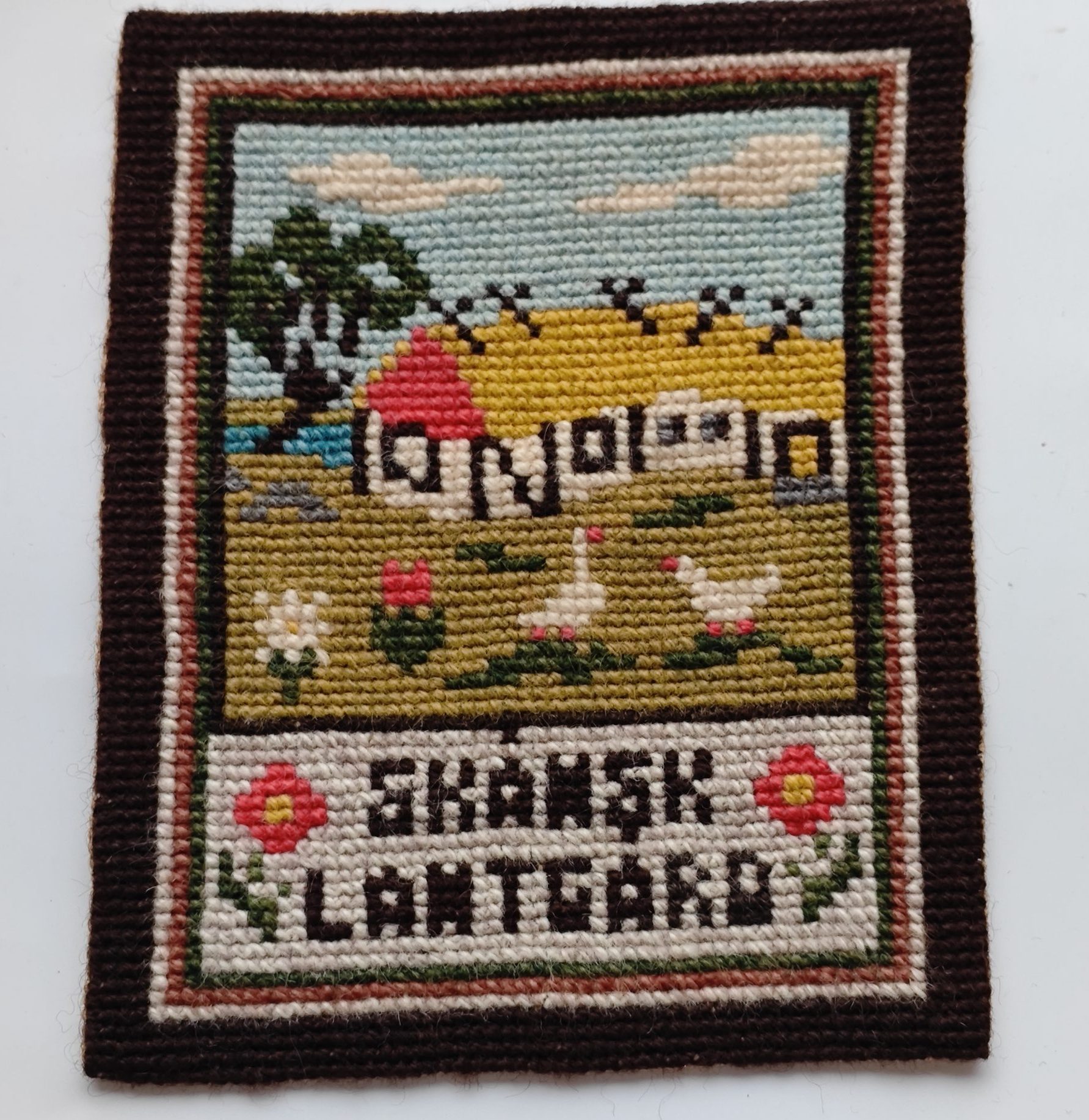 Huisvlijt uit Scandinavië. Wandkleedje Zweden. Maat 17 x 23 cm . Boerderij.