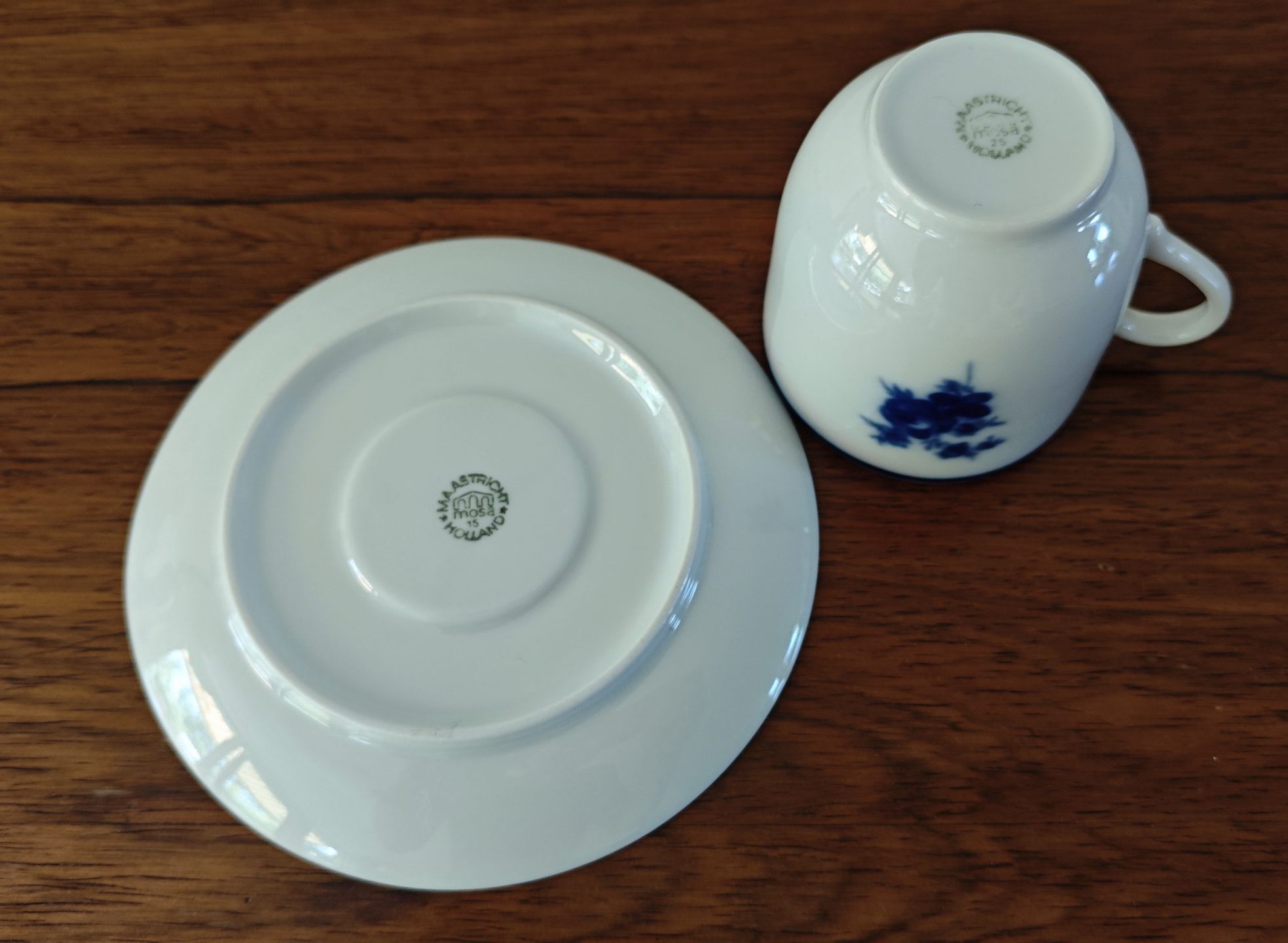 Mosa Maastricht Holland. Koffie Kop en Schotel. Blauw Bloemmotief. Per set van 3.