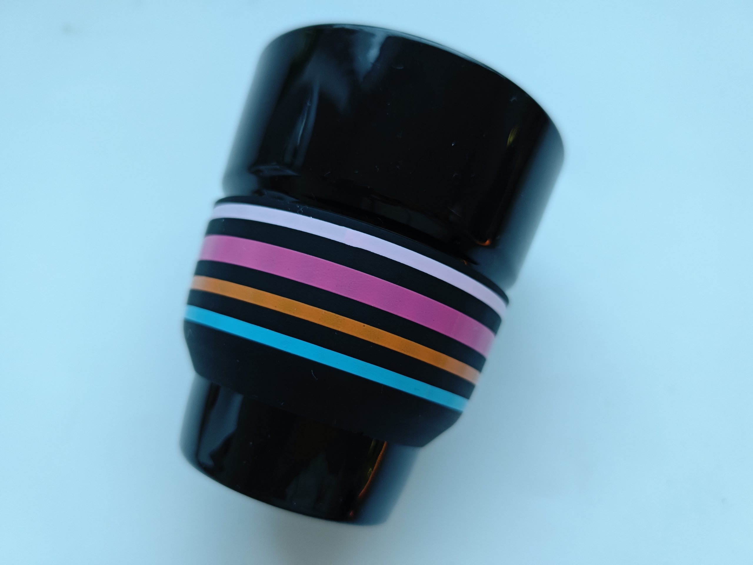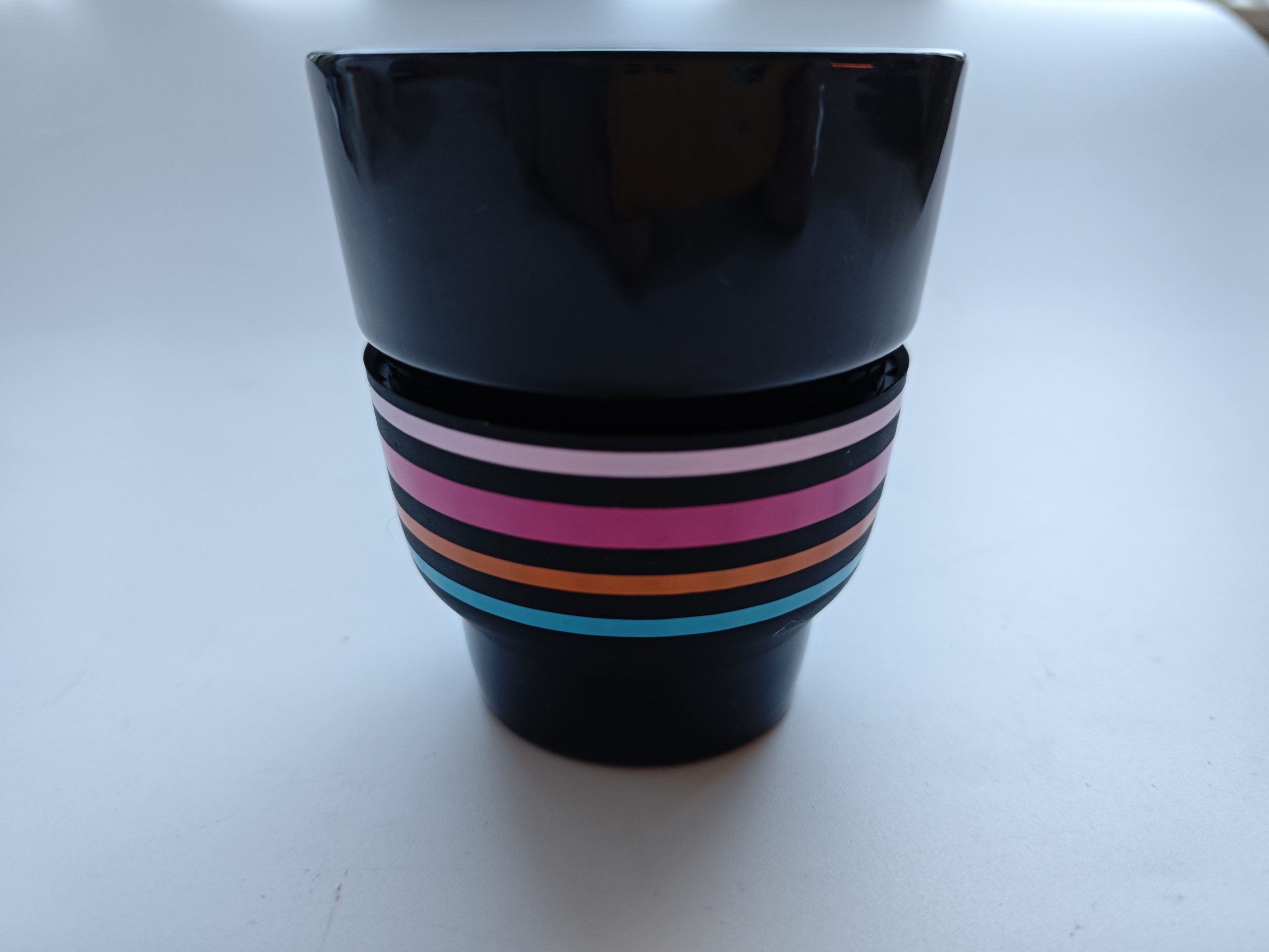 Prachtig glazen kopje met uitbundig gekleurde rand.