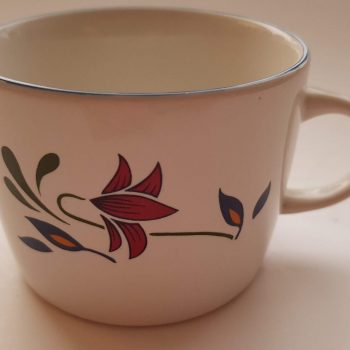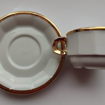 Het oortje apart driehoekig handvat, goudkleurig. Kopje Blauwe binnenrand.