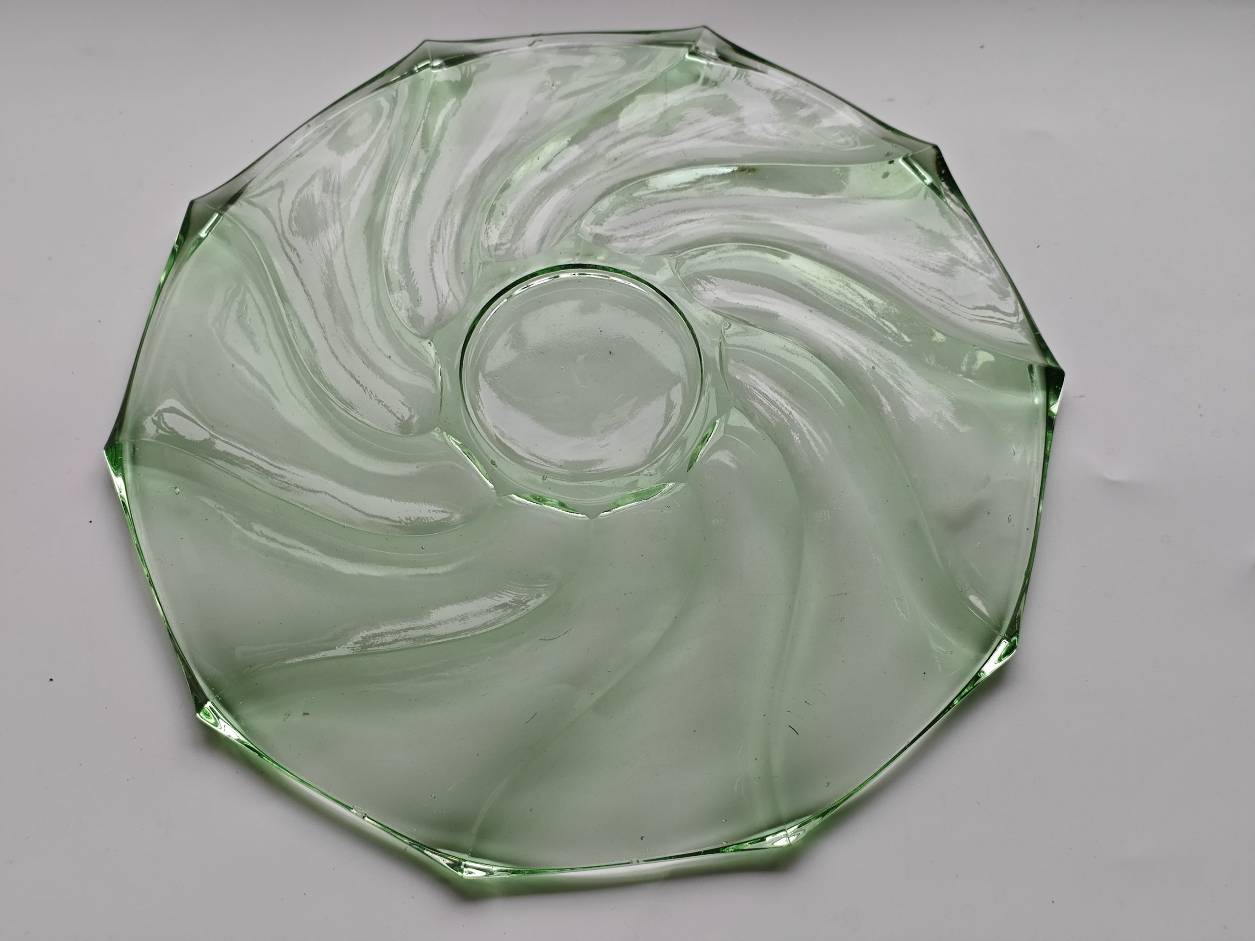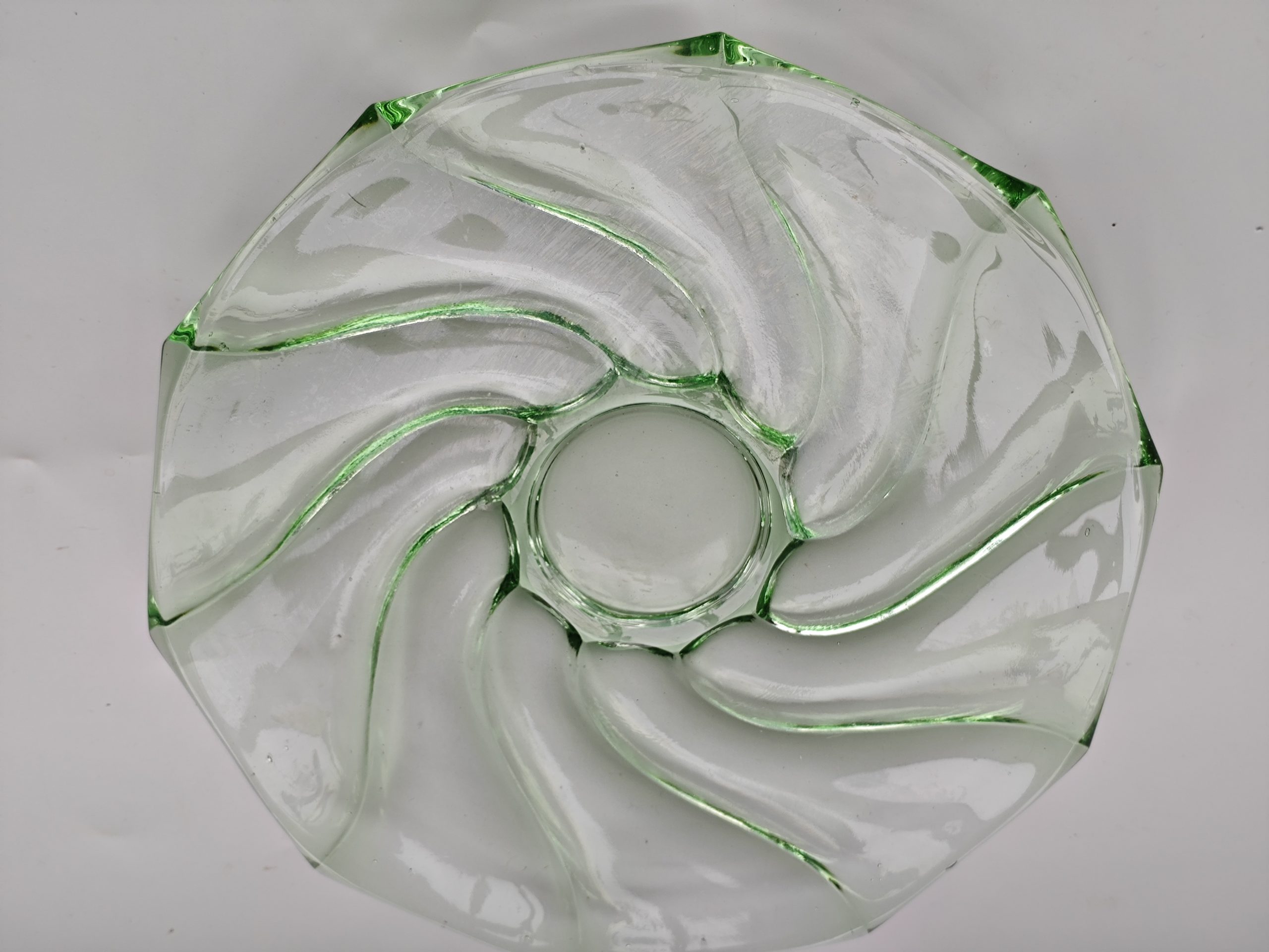 Mooie vintage glazen schaal in een zachte lichtgroene tint. Het glas heeft een speels gedraaid / wervelend motief, waardoor het licht er prachtig doorheen valt. De vorm is strak maar toch decoratief, met een subtiele opening in het midden die het geheel nét even anders maakt.