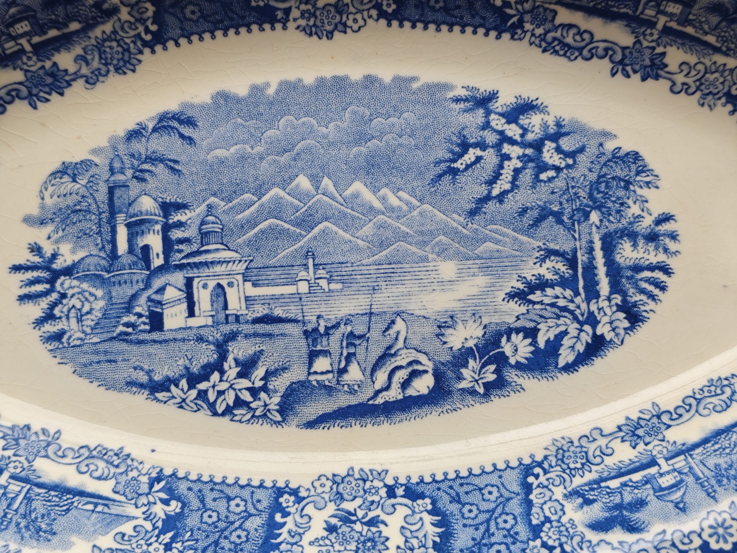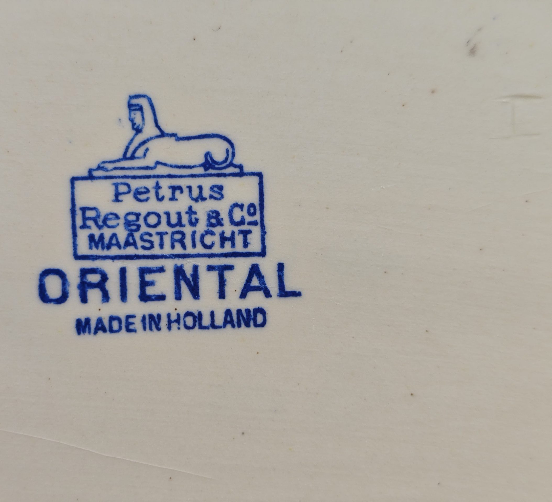 Deze mooie vintage schaal is gemaakt door Petrus Regout & Co. uit Maastricht, een van de bekendste Nederlandse aardewerkfabrieken. Het klassieke blauw-witte Oriental-decor laat een fijn landschap zien, met veel detail en een rijke randversiering. Echt zo’n oud-Hollandse uitstraling die nooit verveelt.